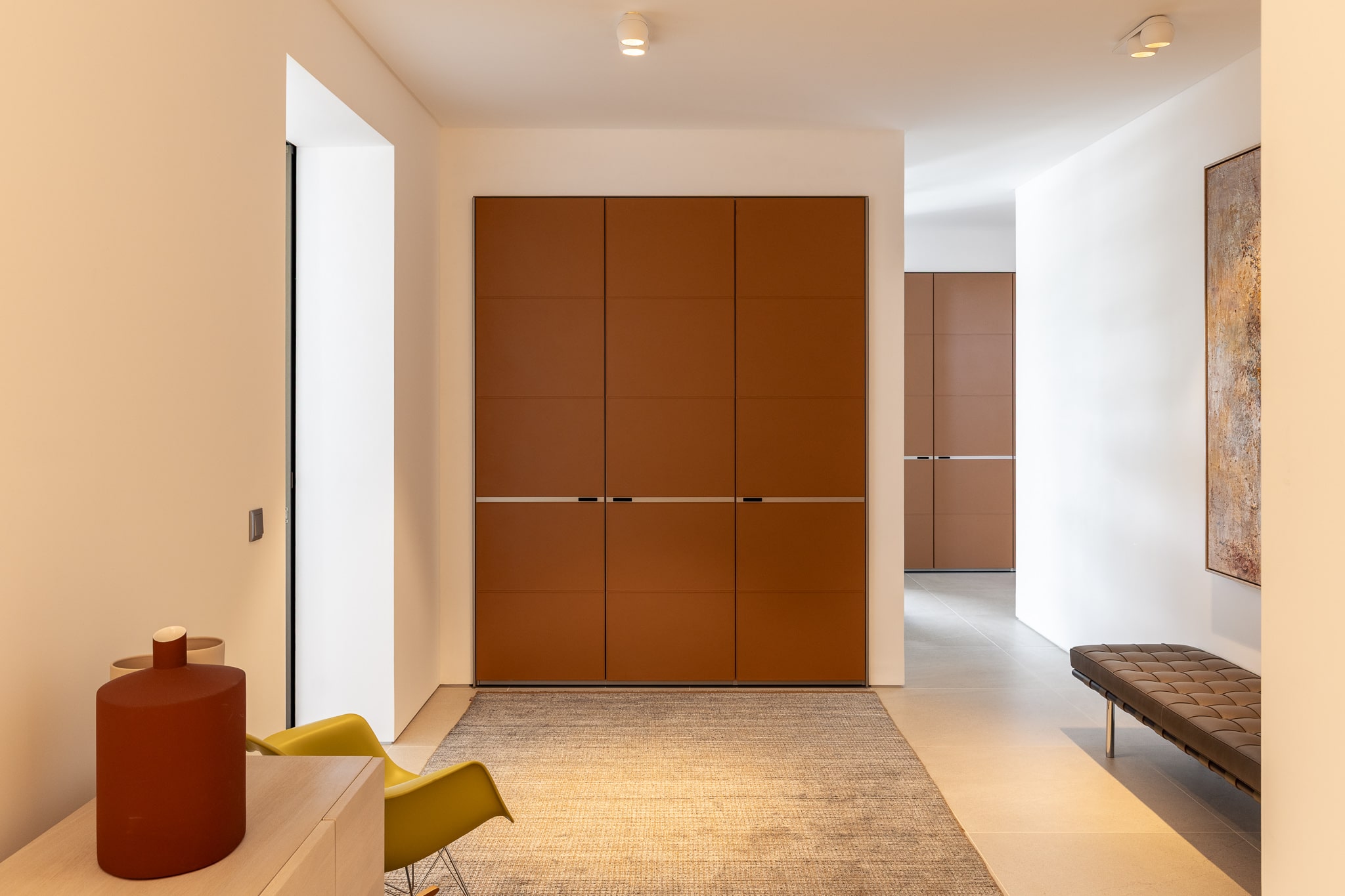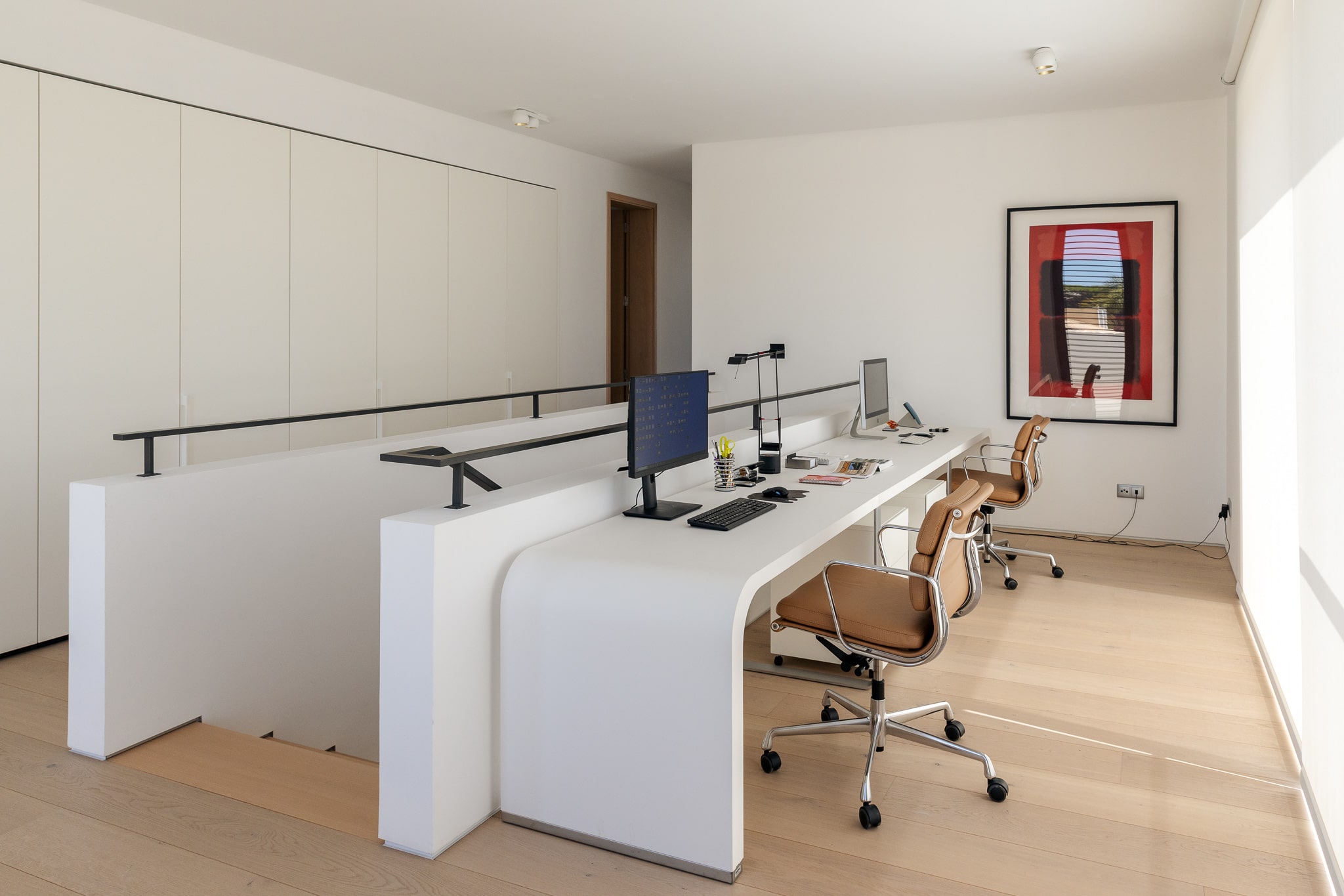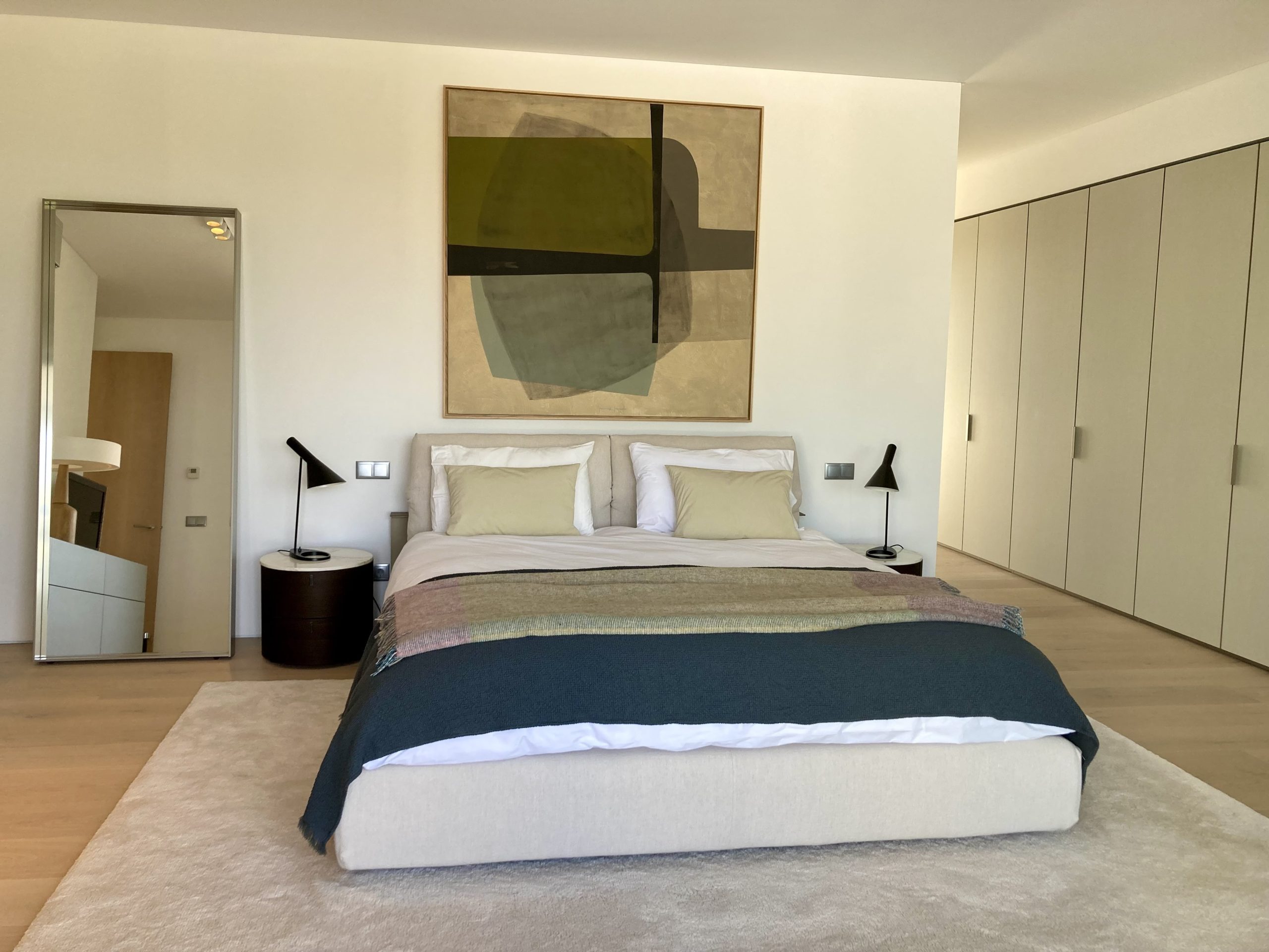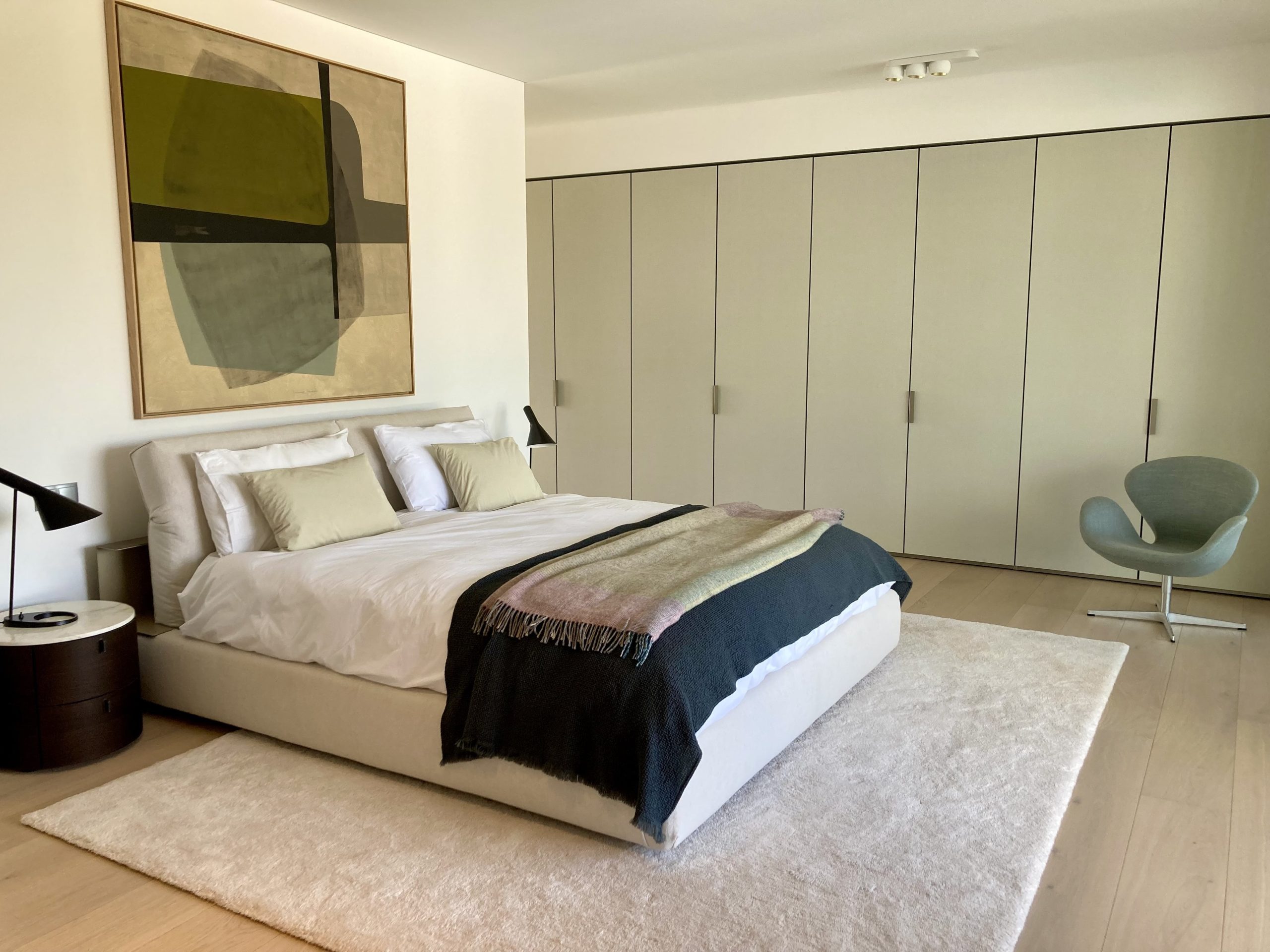 The villa features a range of Poliform wardrobes and two Poliform kitchens and the furniture has been selected from leading brands such as Flexform, Riva, Knoll, Zeitraum, Carl Hansen, Fritz Hansen, and Vitra. The bathrooms are equipped with Agape, a distinguished name in bathroom architecture.