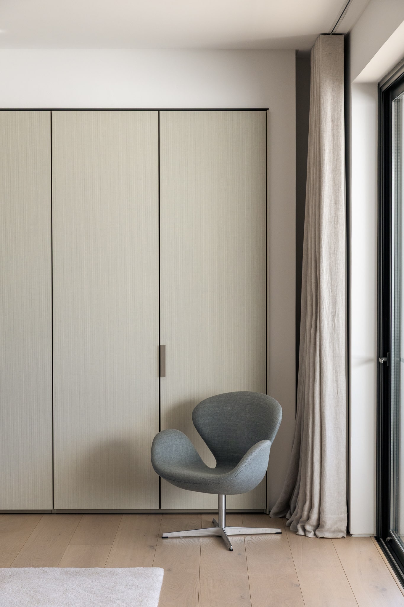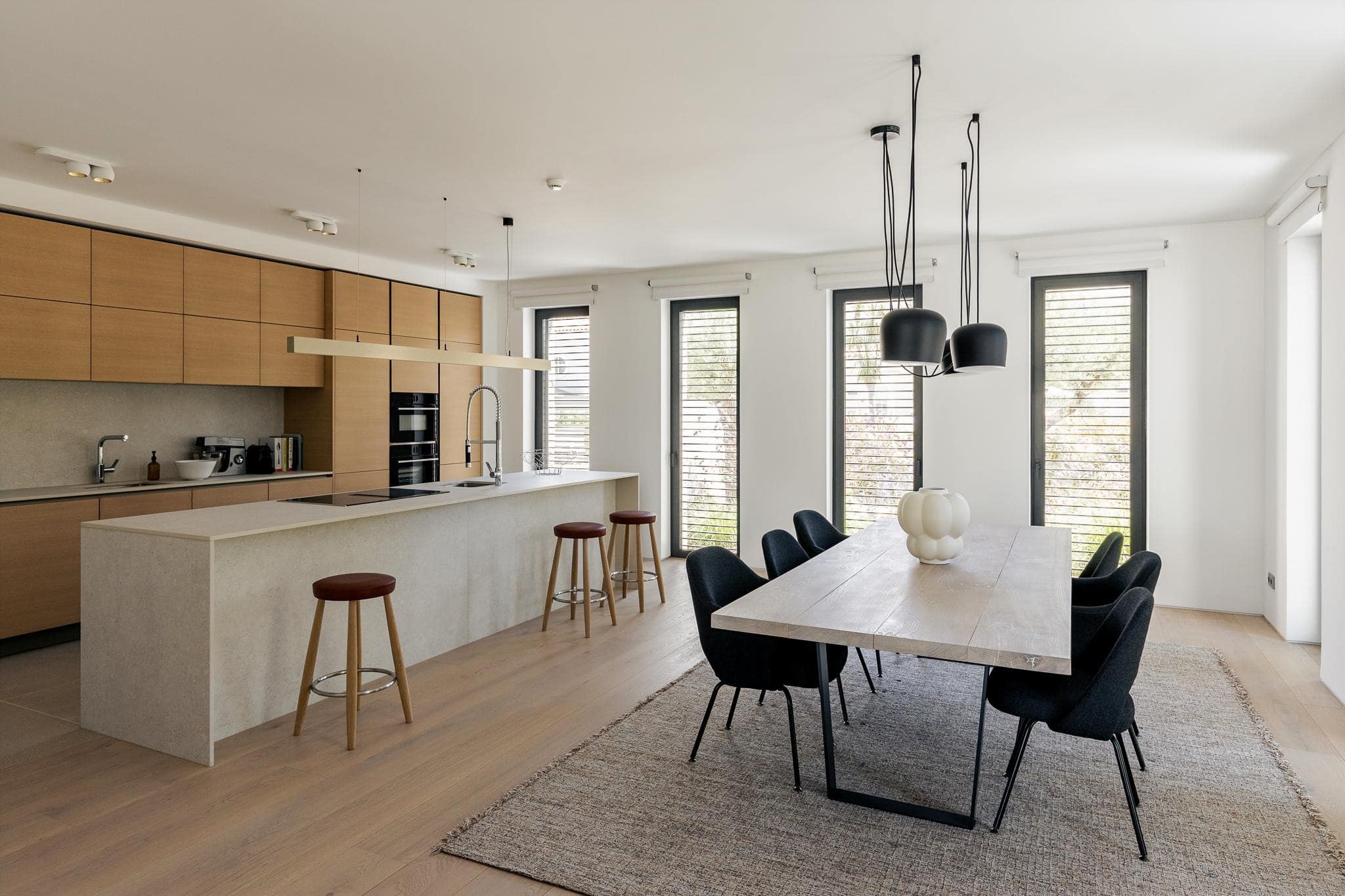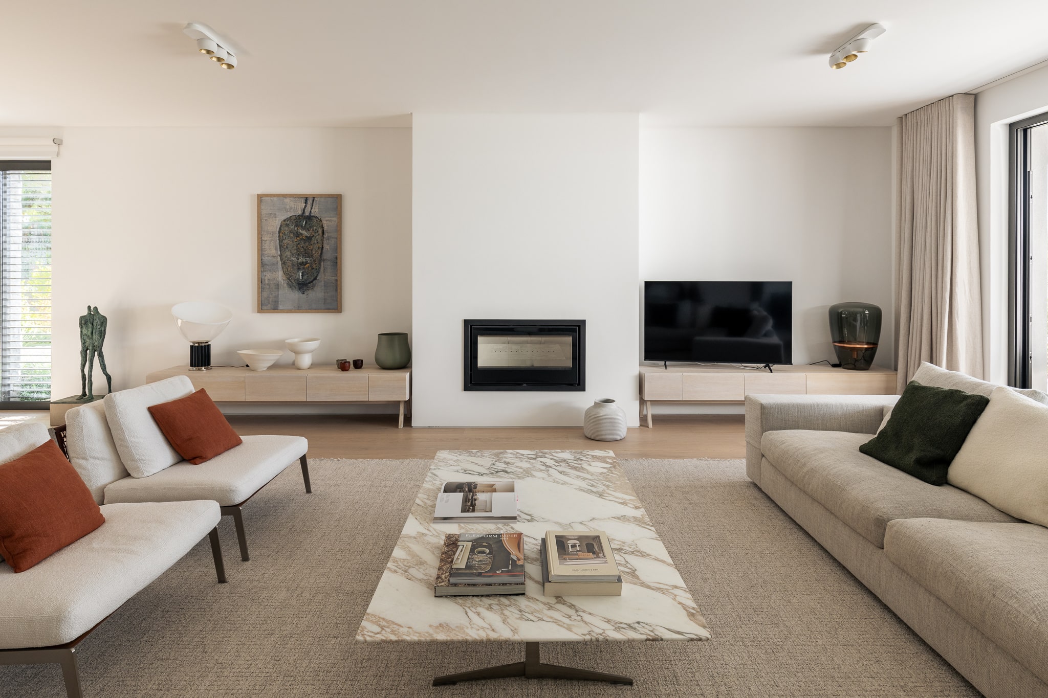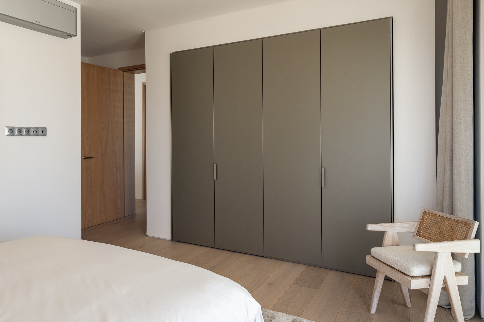 The villa features a range of Poliform wardrobes and two Poliform kitchens and the furniture has been selected from leading brands such as Flexform, Riva, Knoll, Zeitraum, Carl Hansen, Fritz Hansen, and Vitra. The bathrooms are equipped with Agape, a distinguished name in bathroom architecture.